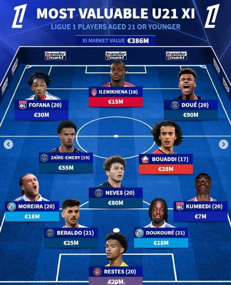 德转列法甲U21最贵阵:杜埃、内维斯领衔巴黎4将,里昂白堡各2人